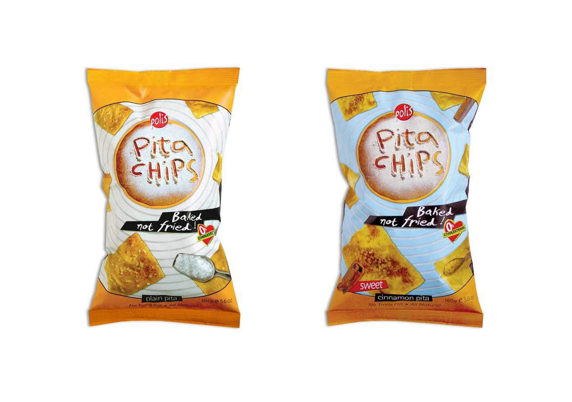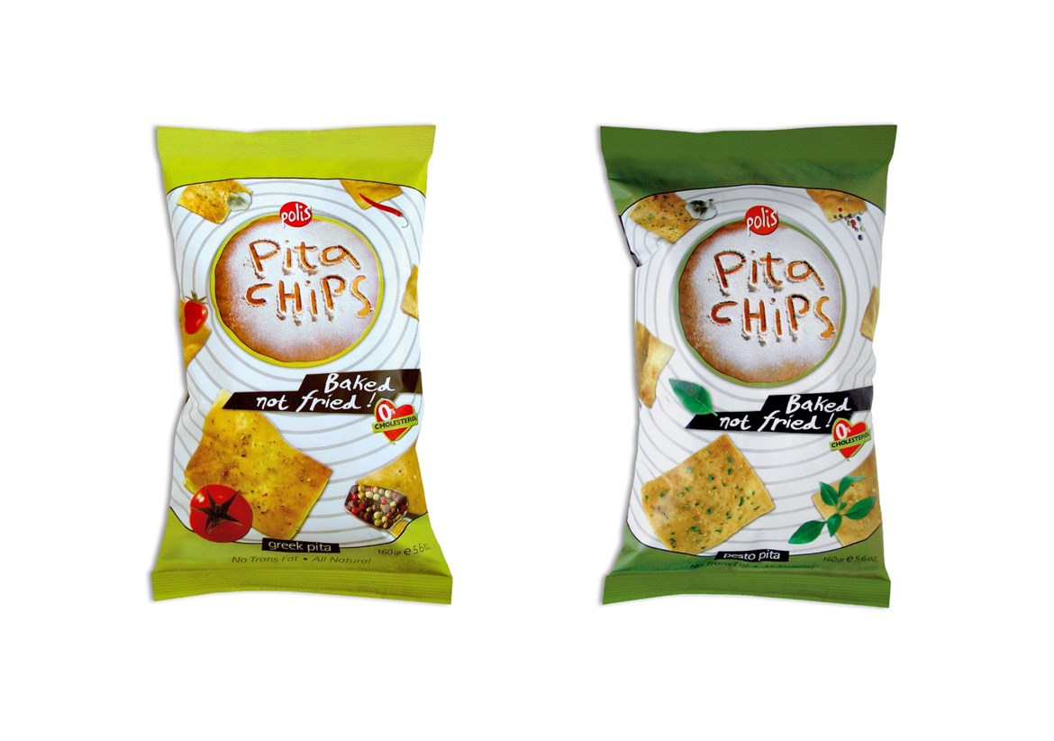Visual identity, branding & packaging design for Pita Chips, a series of baked chips.