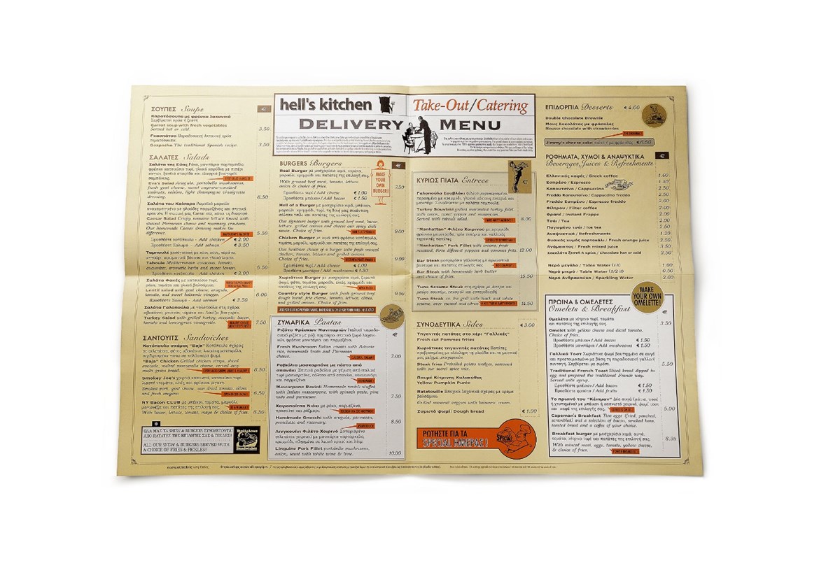 Menu design, for Hell's kitchen, a multi - ethnic bar / restaurant in Athens.